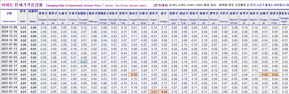 KB주간시계열 차트 25년 4월 18일 / 강남구 과천 양천구 상승 (1) 2025.04.20