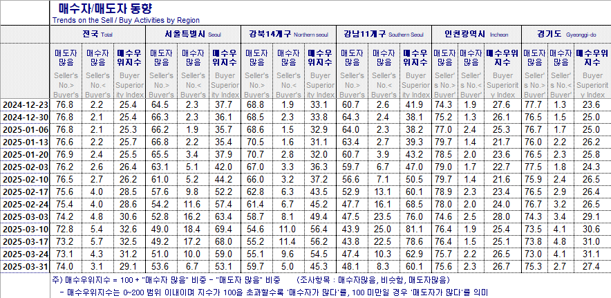 매수우위지수는 100을 초과할수록 "매도자가 많다"를, 100 미만일 경우 "매도자가 많다"를 의미합니다.