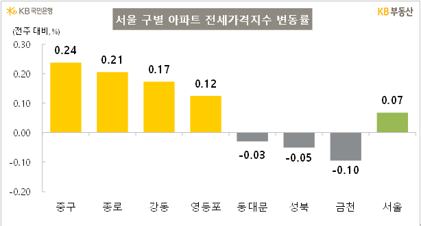 상승은 중구, 종로구, 강동구, 영등포구가 상승이 높았습니다.