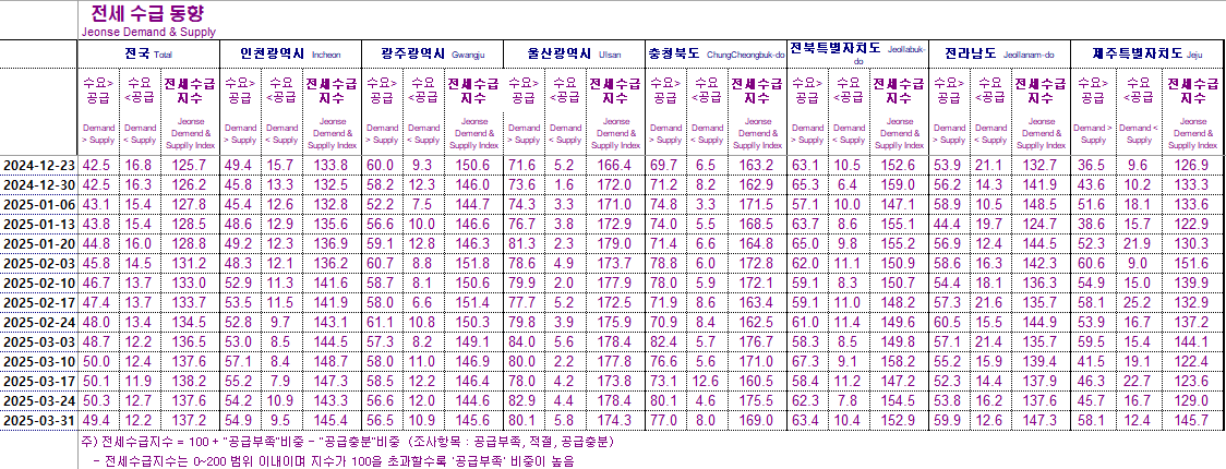 전세수급지수는 지수가 100을 초과할수록 "공급부족" 비중이 높다는 의미입니다.